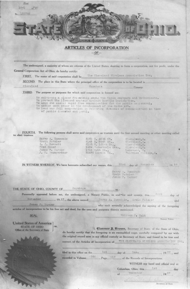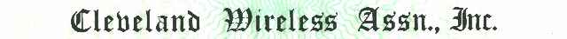 The Cleveland Wireless Association was formed in 1927 during the early years of amateur radio. The club constitution was signed July 1930. During August 25 - September 2, 1929 the Cleveland Wireless Association was granted exclusive control of all communications for the famous Cleveland Air Races, operating from headquarters station W8BF. CWA members who were cited for their flawless operations during the event: